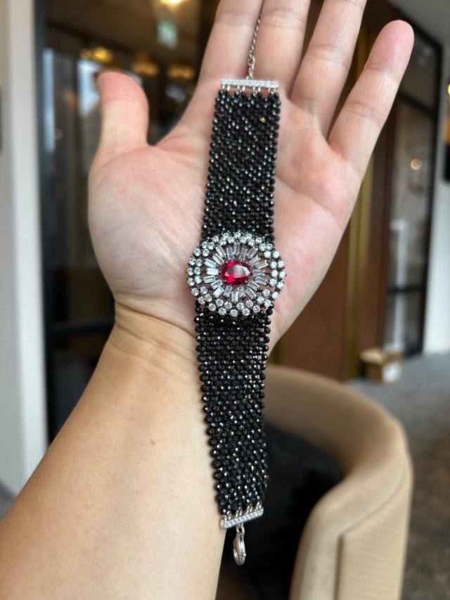 黑尖晶手工編織鋯石仿紅寶石手帶